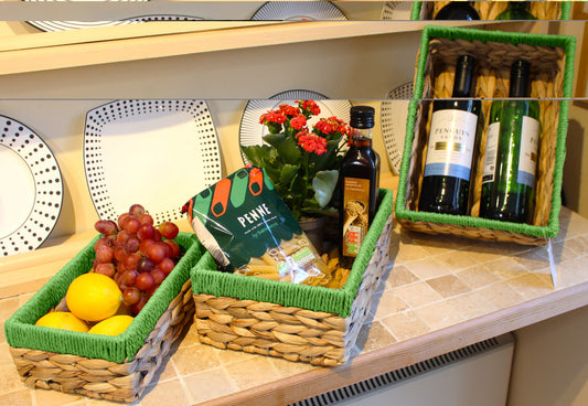 Small water hyacinth rectangular baskets with green edges.